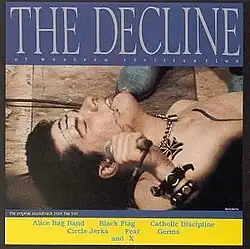 The promotional poster for The Decline, and the record cover of the soundtrack album, featured a close-up frame of Germs singer Darby Crash lying on stage with his eyes closed. Crash died from a heroin-induced suicide before the film was released. The poster was designed before his death.[6]