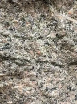 Dedham Granite is a pink to gray medium to coarse grained igneous rock.[3] It is phaneritic, meaning that the crystals are coarse enough to be seen with the naked eye. It is a two mica granite which means there are amounts of both muscovite mica and sericite present. There are also large amounts of quartz and Feldspar (mainly K-feldspar).[3] There are deposits of epidote and chlorite throughout some samples of Dedham Granite. Typically these deposits manifest as green colored veins throughout the rock.[6] Veins typically enter rocks as Hydrothermals when the minerals in the granite were crystallized from hot water or other hot liquids passing through the rock.[7] For Dedham granite alterations of K-feldspar and plagioclase feldspar allow for the formation of the epidote/chlorite vein.[3] Dedham granite typically lacks a magnetic pull meaning that it contains amounts of ilmenite and lacks magnetite.