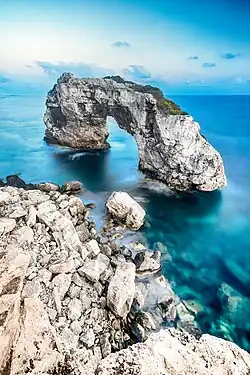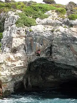 Deep-water soloing has its roots in Mallorca when in 1978, Miquel Riera became frustrated with the aid climbing routes in his local area so he went to Porto Pi, Palma with his friends Jaume Payeras, Eduardo Moreno, and Pau Bover to find routes they could free climb.[13] This became Mallorca's first bouldering venue, and as time progressed, Riera moved onto the nearby sea cliffs where they established DWS routes. Riera and his companions named it "psicobloc" (translated into English, means "Psycho Bouldering"),[14][13] and published articles and photographs in climbing magazines on their activities. Towards the end of the 1980s, Miquel, aided by Pepino Lopez, Xisco Meca, Pepe Link, and Miki Palmer, had discovered the short sea cliffs of Cala Varques, Cala Serena, and the impressive cliff in Porto Cristo, now known as Cova del Diablo.[13] Three notable routes were established at Cova del Diablo: Surfing in the Bar, Surfer Dead, and Surfing Bird.[13]