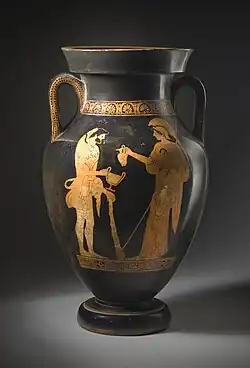 - ^ "Amphora with Athena Pouring Wine for Herakles, and a Woman Pouring Wine for Dionysos". Los Angeles County Museum of Art. Retrieved 2 April 2020.