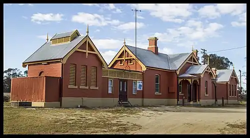 The station itself consisted of a single brick platform with gravelled surface,[11] located on the western side of the line, with a large collection of station buildings on the platform. An iron watertank and water column were constructed at the northern end of the platform, with two jib cranes used for double headed steam services.[1]