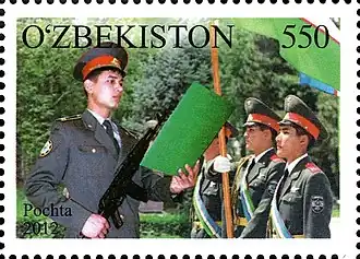 On this day military units of the Tashkent Garrison line up in Independence Square, and accept congratulations and awards from the president and the minister of defense.[3] Holiday activities also include a wreath laying ceremony at the Monument to the Independence of Uzbekistan and the Timur monument.[4][5][6] On the holiday in 2019, the Oliy Majlis organized a round-table discussion on the topic "The Motherland is sacred and its defense is an honorable duty".[7]