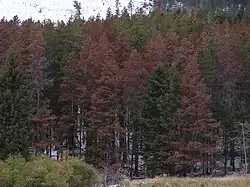 Invasive species are those that are not native to a region, and have the ability to displace local species and disrupt natural ecological processes.[16] The mountain pine beetle has a significant negative effect on mature conifer stands.[16] The occurrence of pine beetle outbreaks are influenced by warmer temperatures from mild winters which reduce the mortality of beetle larvae during the winter.[16] From 1995 - 2005, British Columbia experienced a decline in the health of conifer trees and this was found to be correlated with the increase in the proportion of beetle-attacked conifers.[16] In addition to the mountain pine beetle, other destructive invasive species include bark beetles, douglas fir beetles, spruce beetles, spruce leader weevil, and western spruce budworm.[21] Climate change impacts the distribution, life cycles, habitats, and mortality rates of these invasive insects.[22] With a warming climate, there is a greater accumulation of the larvae of invasive species which increases the feeding and predation stresses on tree hosts.[21] The impact from invasive species in British Columbia are both ecological and economic, due to the disruption of the timber supply available for harvest.[21][22]
