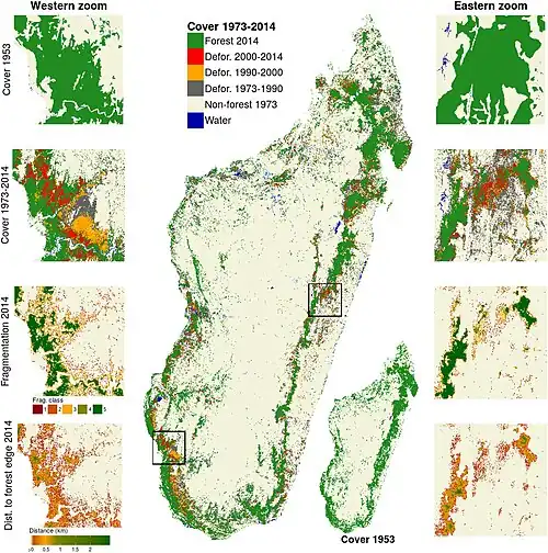 The main figure in the diagram on the right shows the changes in forest cover from 1973 to 2014. Forest cover in 1953 is shown in the bottom-right inset. Two zooms in the western dry (left part) and eastern moist (right part) ecoregions present more detailed views of (from top to bottom): forest cover in 1953, forest cover change from 1973 to 2014, forest fragmentation in 2014 and distance to forest edge in 2014. Data on water bodies (blue) and water seasonality (light blue for seasonal water to dark blue for permanent water) have been extracted from Pekel et al. (2016).[19][16]