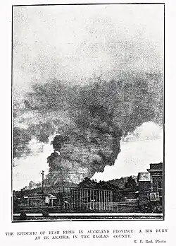 When the first Europeans arrived, in 1769, there was still thick, dense forest cover. Early explorers such as Cook and Banks described the land as "immense woods, lofty trees and the finest timber".[6] Timber was mainly used for repairs to sailing ships until the 19th century. With the colony of New South Wales rapidly expanding in population, the need for timber from New Zealand began to rise. Timber exports, mainly kauri, became a major industry for New Zealand. There are records from the 1840s stating that 50 to 100 ships could be tied to shore in Kaipara Harbour and be filled with lumber from giant floating booms that could hold 10,000 logs at a time.[7] Besides as a form of lumber, many pioneers found the kauri trees valuable for the gum they produced to make varnish and linoleum, primarily in the north island near Auckland. The colonists used unconventional methods to gather this gum from living trees. Stripping these trees and the ground around them resulted in the destruction of the land, rendering it unusable for agriculture (Wynn pg. 108). Without the trees to hold the soil and debris to the land, water flowed freely, causing frequent and regular flooding. As most of New Zealand was covered with thick bush, the slash-and-burn technique was often used to prepare land wanted for farming in forested areas. This practice was not carried out very responsibly due to the complexity of controlling a fire, and unintentionally resulted in large areas of land catching fire.[6] Thousands of acres were accidentally burned and destroyed.