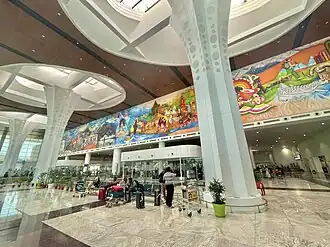 The new terminal initially covered an area of 12,950 m2 (139,400 sq ft), was capable of handling 1,800 passengers during peak hours and about 2 million passengers annually, which now increased to an area of 42,776 m2 (460,440 sq ft), an apron capable of handling 20 Airbus A320 and Boeing 737 type aircraft, and is able to handle 3,240 passengers during peak hours and 4.7 million passengers annually, thereby expanding the capacity of the airport by eightfold.[17] The new terminal building has a concourse, check-in areas, security hold and arrival lounge on the ground floor, security hold at first floor, and various offices on the mezzanine floor.[18]