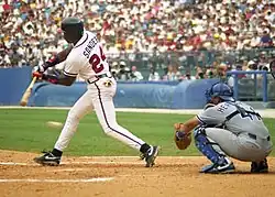During the 1992 season, his best year in the majors, Sanders hit .304 for the team, stole 26 bases, and led the NL with 14 triples in 97 games.[6] In four games of the 1992 World Series, Sanders batted .533 with four runs, eight hits, two doubles, and one RBI while playing with a broken bone in his foot. His batting average, on-base percentage, slugging percentage, total bases and win probability added each led the team in the series. Despite Sanders' performance, the Braves ultimately lost to the Toronto Blue Jays in six games.[24] In Game 3, he narrowly avoided being a victim of what would have been only the second triple play in World Series history (following Bill Wambsganss' unassisted triple play in 1920). With Sanders on second base and Terry Pendleton on first, David Justice hit a deep fly ball to center field that Blue Jays center fielder Devon White unexpectedly caught with a leaping effort. Pendleton passed Sanders on the bases for the second out, but umpire Bob Davidson called Sanders safe after he scampered back to second base. Replays showed that Toronto third baseman Kelly Gruber tagged him on the heel before he returned to second.[25]