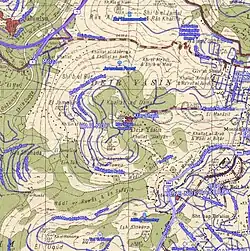 Deir Yassin was built on the eastern slopes of a hill, with an elevation of roughly 800 meters (2,600 ft) above sea level and commanding a wide view all around it. The village faced the western suburbs of Jerusalem which were 1 kilometer (0.62 mi) away. The city center of Jerusalem was about 5 kilometers (3.1 mi) to the east. It was separated from the city by a terraced valley planted with fig, almond, and olive orchards. Along the northern rim of the valley ran a secondary road linking Deir Yassin to the suburbs and to the main Jaffa Road which was about 2 kilometers (1.2 mi) to the north.[4]