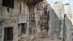 The façade, entirely hewn from the natural rock, faces onto a courtyard measuring approximately 15 by 20 meters, which has been cut into the rock in front of the hypogeum.[5] Within the hypogeum are three carefully masoned burial chambers and an antechamber.[5] The interior walls of the entrance hall are carved with 'imitation' courses of ashlars.[4] These are rendered with drafted margins.[4]