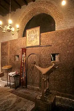 The Church of al-Adhra (Church of the Virgin) at the monastery was built over an ancient cave. It is claimed that Mary and Jesus spent six months and ten days here on their flight into Egypt from King Herod.[6] The altar stone is dated 747 CE.