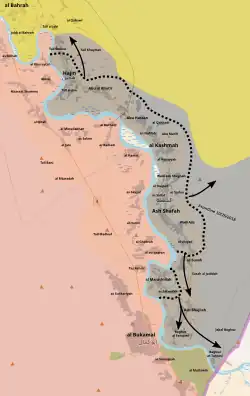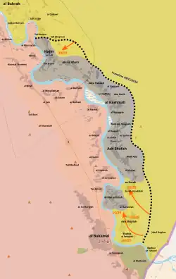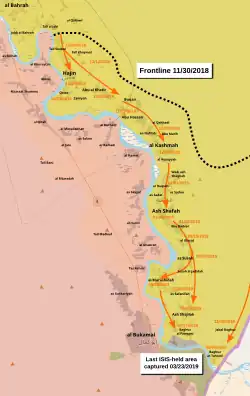 On 7 November, the SDF captured a village while advancing on the southwest along Khabur.[132] The SDF captured the key town of Markadah on 8 November.[133] On 12 November, the SDF captured al-Busayrah and all neighboring villages, thereby eliminating an ISIL pocket to the east of the Euphrates.[134] The SDF captured the al-Tanak oil fields on the next day.[135] On 14 November, the SDF pushed southwards along the river, capturing a village and killing 11 ISIL militants.[136] By the next day, they had advanced within 15 kilometres (9.3 mi) to the border with Iraq, according to the Syrian Observatory for Human Rights (SOHR).[137] After ISIL lost Al-Qa'im and Abu Kamal to the Iraqi and Syrian Army, respectively, ISIL moved its de facto capital to the Syrian city of Hajin, in the Middle Euphrates Valley.[29]