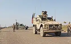 On 1 May 2018, the SDF and U.S.-led coalition, in coordination with the Iraqi Armed Forces, announced the restart of the offensive to clear the Iraqi-Syria border and middle Euphrates river valley (MERV) of ISIL remnants, in what the coalition called Operation Roundup.[73][5] On 3 May, Syriac Military Council and SDF spokesperson Kino Gabriel stated that SDF forces had advanced 8 kilometers (4.97 mi.) into ISIL territory on the al-Bughuz axis along the Iraqi border near the Euphrates river valley.[179] On 8 May, an official YPG Twitter account posted images of SDF forces using mine-resistant ambush protected vehicles (MRAPs) partaking in an assault on ISIL front lines. The vehicle was previously unauthorized to be provisioned to SDF forces; Pentagon spokesman Marine Maj. Adrian Rankine-Galloway confirmed to Military Times that the US was providing MRAPs to the Syrian Arab Coalition, which he called "an essential component of the SDF."[180]