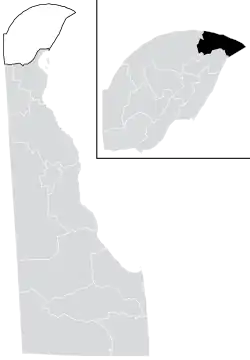Like all districts in the state, the 5th Senate district is located entirely within Delaware's at-large congressional district. It overlaps with the 6th, 7th, 10th, and 12th districts of the Delaware House of Representatives.[5] The district also borders Pennsylvania along the Twelve-Mile Circle.[1]