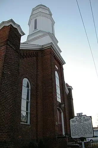 Delevan Baptist Church, also known as First Baptist Church and First Colored Baptist Church, is a historic African-American Baptist church building located at 632 W. Main Street in Charlottesville, Virginia. It was built in 1883, and is a one-story, three bay by six bay, Victorian Romanesque style brick church. It sits on a raised basement and features with a square projecting central tower topped by a large octagonal lantern on a square base, both of wood.[3]