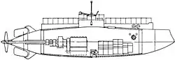 The submarine that was later renamed Delfin had a single hull, the outside of which was covered with teak as protection in case of grounding, and saddle tanks. Its propulsion was provided by two 150 hp (110 kW) gasoline engines for moving on the surface and by one 120 hp (89 kW) electric motor to move the boat underwater, giving power to the one propeller shaft.[6][7] An engineer involved with the project, Ivan Goryunov, proposed equipping it with diesel engines, but there were limitations on their production and ultimately gasoline engines were used instead.[4] This gave it a speed of 9 knots (17 km/h; 10 mph) while surfaced and 4.5 knots (8.3 km/h; 5.2 mph) while submerged, along with a total range of 243 nmi (450 km) surfaced and 35 nmi (65 km) submerged.[6]