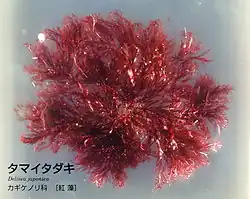 Delisea pulchra is a red algae found in Southern Australia, New Zealand, the Subantarctic Islands and the Antarctic Peninsula.[1] It produces a range of secondary metabolites called halogenated furanones that have ecological roles as defenses against epiphytes and herbivores.[2]