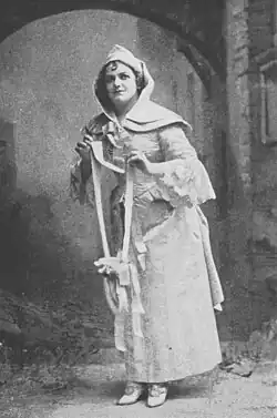 In describing her first supporting role with DeWolf Hopper, Strang wrote: "Her success in this larger field was remarkable, and before the summer was over she was sharing the honors with Hopper and was just as strong a popular favorite as he. Her Blanche was a delightful creation throughout, but best remembered is the "athletic duet" in which she and Hopper gave amusing pantomimic representations of games of billiards, baseball, and other familiar sports."[11] Of her role in Wang, Strang wrote: "This was, perhaps, the most artistic of all her roles. She was cute, impish, and jaunty in turn as the Crown Prince, and, in addition, was a picture never to be forgotten in her perfect fitting white flannel suit, worn in the second act."[12]