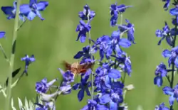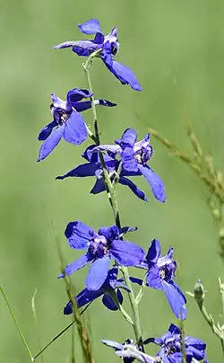 The butterflies Papilio zelicaon (Anise Swallowtail) and Erynnis telemachus (Rocky Mountain Duskywing) visit the flowers of Delphinium geyeri.[21] It is seldom fed upon by herbivorous insects like the common grasshopper Melanoplus sanguinipes due to the alkaloid content of its foliage.[22]