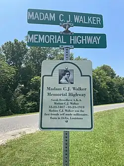 As the birthplace of African-American entrepreneur Madam C. J. Walker, the first American woman to become a millionaire by her own business achievements, it has been included as one of 26 featured sites on the Louisiana African American Heritage Trail. In nearby Tallulah, the parish seat, a related site is the Hermione Museum, which has an exhibit about Walker.