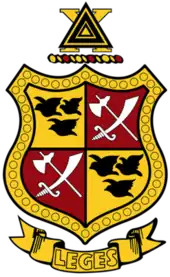 Delta Chi's motto is Leges (Law).[5] The fraternity's colors are red and buff.[5] Its symbol is the knight and the martlets. Its flower is the white carnation.[5] Its magazine is Delta Chi Quarterly, first published in April 1903.[2] Its nickname is D-Chi.[5]