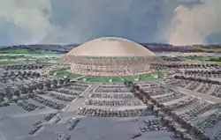 The idea for a stadium at Delta Park in Portland, Oregon, was started by a development group in the summer of 1963. They looked at building a domed stadium, similar to the Harris County Domed Stadium in Houston, Texas, which was under construction at the time.[3] Plans for the Delta Dome called for a 46,000 seat capacity that could be expanded to 80,000, or possibly 100,000. Also included were plans for a 17,000 vehicle parking lot.[4] Architects said the ceiling of the dome would be made from plexi-glass, which would add natural light. The skylights, which could be opened, were intended to add an open-air feel to the building. It was scheduled to be completed by 1968.[5] It was estimated to cost US$25 million (US$253.5 million adjusted for inflation).[6]