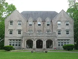It is a three-story, seven-bay, Tudor Revival style building faced in Indiana limestone. The building was originally H-shaped, but has been enlarged. It has a hipped roof and three-bay protruding porch on the first floor.[2]: 5
