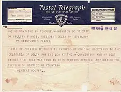 In the 1950s, some members suggested that the fraternity accept women.[4] Gregory Creutz (Alpha 1921), national general secretary led the way to a compromise.[4] In 1956 the National Board of Directors of the fraternity created the Delta Phi Epsilon International Society of Business and Foreign Affairs which was to be open to both men and women.[7][4] However, that society failed to develop,[8]