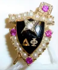 After the merger in 1931, Delta Phi adopted a new crest that included a shield that was decorated with a four-pointed jeweled star, the lamp of learning, a scroll, and the Greek letters ΔΦ.[8] Member pins were a simplified version of the shield, featuring the star and Greek letters on a black background.[8] The fraternity had three pins—a pledge pin, a Greek letter pin, and a membership pin. Only initiates could wear the latter two pins.[8]