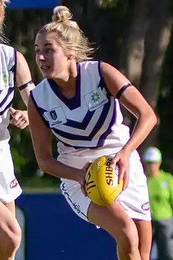 Demi Okely (born 19 March 1997) is an Australian rules footballer who played for the Fremantle Football Club in the AFL Women's competition. Okely was drafted by Fremantle with their 16th selection and 125th overall in the 2016 AFL Women's draft.[1] She made her debut in the thirty-two point loss to the Western Bulldogs at VU Whitten Oval in the opening round of the 2017 season.[2] She played every match in her debut season to finish with seven matches.[3] She was delisted at the end of the 2017 season.[4]