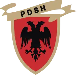 The party's main symbol consists of the black double-headed eagle found on the Albanian flag, but with white eyes, on a red background, again, found on the Albanian flag. This background is encased in a golden outline, with a waving flag-like object of the same colour, but with bold, black letters saying, "PDSH." The party flag is the coat of arms of the party, but with a red background, found on the Albanian flag.