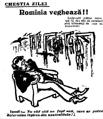 For the following year, with Romania still neutral, Onciul supported schemes that would prevent her joining the war against Austria and the other Central Powers. Together with the Bessarabian Constantin Stere, he sought to obtain more collective rights for Romanians in Transleithania, and thus prevent Romania from having a casus belli; he believed that the best scenario was for Romania to fight alongside Austria, and receive Bessarabia as a reward, or even to be peacefully annexed by the empire.[124] The latter proposal vexed Iorga, who replied that "Romania as a state is no Belgium, to exist [only] as a customs office", but the representation of a "healthy people, with its future ahead."[125] Also then, Onciul mediated between the Romanians of Transylvania and the Prime Minister of Hungary, István Tisza, asking Tisza to curb Magyarization policies, reform the electoral law, and give semiofficial status to the Romanian language.[126]
