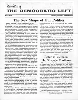 The publication that would become the official organ of DSOC was initially an eight-page letter-sized monthly called Newsletter of the Democratic Left (the name was later shortened to Democratic Left). The first issue appeared in March 1973 under the editorship of Michael Harrington. He had prior experience working on SPA's weekly newspaper, New America,[28] with Jack Clark as his Managing Editor.[29] A front-page essay by Harrington in the debut issue, entitled "The New Shape of Our Politics", made nary a mention of the bitter factional fight that preceded DSOC's formation: