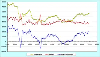 The following table chronicles factors such as population, birth rates, and death rates in Luxembourg since 1900.[6]