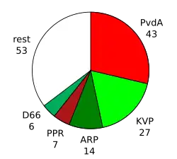 After the 1972 general election the Labour Party (PvdA) of Joop den Uyl was the winner of the election, winning four new seats and having now a total of 43 seats. Prior to the election the PvdA had formed a political alliance with the progressive Christian Political Party of Radicals and the social liberal Democrats 66, but this alliance failed to achieve a majority in the House of Representatives. After lengthy negotiations the Christian democratic Catholic People's Party (KVP) and Anti-Revolutionary Party (ARP) agreed to start talks about joining the coalition. During the formation negotiations between the parties were difficult because of disputes between uncompromising left-wing radicals and the moderate factions of the left-wing parties and the left-wing Christians. In the end both the KVP and the ARP joined the cabinet.