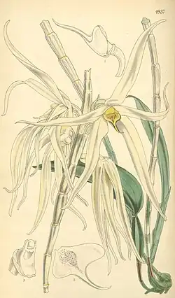 The flowers, up to four per inflorescence, are produced on very short racemes. Both leafless and leaved pseudobulbs are capable of producing an inflorescence. The flowers are up to 20 centimetres (7.9 in) across. The sepals and petals droop producing a distinctly wispy appearance.[1]