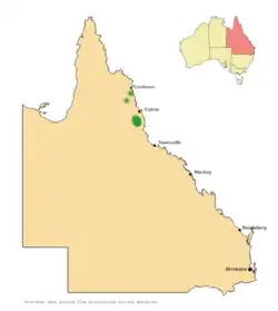 D. cordifolia is restricted to a small part of north-eastern Queensland, specifically the Atherton Tableland and nearby areas, at elevations from 100 to 1,200 m (330 to 3,940 ft).[4] It grows as an understory plant in disturbed areas of rainforest, such as treefalls, creek margins, roadsides, and man-made clearings.[4]