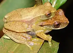 Dendropsophus branneri is a small hylid tree frog endemic to the Atlantic Forest region of Brazil.[3] It feeds mainly on arthropods[4] and is preyed upon by various invertebrates (e.g., giant aquatic bugs, spiders) and vertebrates (e.g., snakes, birds).[5] Although currently classified by the IUCN Redlist as "least concern",[1] D. branneri suffers rapid habitat loss due to residential development, agriculture, logging, and clearing for pastureland.[3][6] Male D. branneri are noted for their fighting call, which differs significantly in frequency, duration, and pulses per call compared to their mate advertisement call.[7] Males are also noted for their willingness to escalate physical altercations against other males, which includes kicking, pushing, and wrestling their opponent into non-dominant positions.[7] Unlike most other frog species, D. branneri can breed in both temporary and permanent pools allowing it to inhabit a wide variety of habitats leading to its wide distribution.[8]