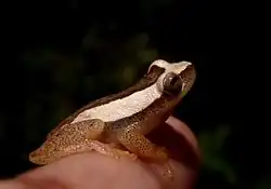 Adult males measure 16–19 mm (0.6–0.7 in) and adult females 22–24 mm (0.9–0.9 in) in snout–vent length. The snout is short. The tympanum is distinct and relatively large. The canthus rostralis is distinct. The fingers and toes have rounded discs and are partially webbed. Dorsal coloration is variable, but most individuals are dark brown with white snout and stripes running laterally to the inguinal region.[2]