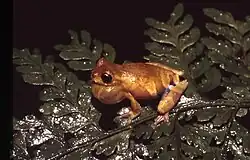 Dendropsophus parviceps (common name: Sarayacu treefrog) is a species of frog in the family Hylidae. It is found in the Amazon Basin of Bolivia, Brazil, Colombia, Ecuador, Peru, and Venezuela.[2] Dendropsophus parviceps is a locally common species with no known threats. These frogs are found on the leaves and branches in primary and secondary tropical rainforest, but also in open spaces close to forests. It is found in moist habitats (swamps, temporary watercourses, permanent ponds). It breeds in temporary bodies of water. Eggs are laid in water where the tadpoles develop.[1]