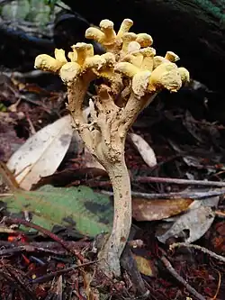 The fruiting body of D. eberhardtii is a stiff, brown, branching root like structure with a 10–15 cm long, 3-6mm thick stem terminating in multiple 2-6mm thick sporulating heads that start white before maturing to golden yellow.[3]