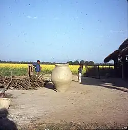 Denhari (Nepali: देनहरि) or Dehari(Nepali: देहारि) is a traditional earthen vessel used to store food grains by Tharu people of Nepal. It is made by using loamy clay, paddy straw and rice husk and has a round, rectangular or conical shapes. It is mostly made by females and mostly used to store paddy, wheat, rice, maize, lentils, peas and mustard seeds.[1]