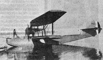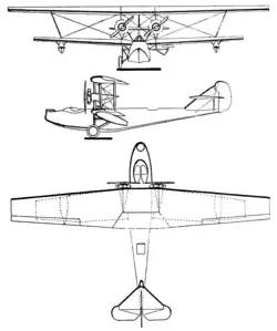 Structurally the wings were wooden, with two spars and plywood-covered leading edges; elsewhere the covering was fabric. The wings were braced together on each side by a pair of parallel, outward-leaning interplane struts. Below these, steeply angled stabilizing floats were attached close to the lower wing underside with short struts. To minimise hangar space, the outer wings could be folded back alongside the hull.[1]