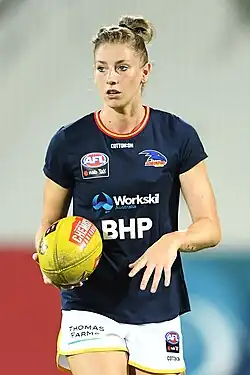 Varnhagen was drafted by Adelaide with their fourth selection and twenty-sixth overall in the 2016 AFL Women's draft.[7] Phil Harper, the General Manager of Football Administration, who had coached her at Happy Valley said that "she was a bit of a star all along."[2] She made her debut in the thirty-six point win against Greater Western Sydney at Thebarton Oval in the opening round of the 2017 season,[8] kicking a goal, tallying twelve disposals, and catching a team-high four marks.[2] She helped Adelaide claim their first premiership, scoring a goal in the club's six point victory over Brisbane at Metricon Stadium in the AFL Women's Grand Final.[9][10] She played every match in her debut season to finish with eight matches.[11] Adelaide signed Varnhagen for the 2018 season during the trade period in May 2017.[12] In 2019, Varnhagen helped Adelaide became a dual premiership player, helping Adelaide claim their second premiership. She won Adelaide's Best Defensive Player award, averaging a career-best 11 disposals, 2.1 tackles and 1.9 rebound 50s per game. As well as her defensive pressure, she also kicked four goals and delivered 45 inside 50s.[13] In 2021, Varnhagen was the source of some controversy after refusing to be vaccinated for COVID-19.[14] At the time, the league did not have a vaccination policy. After the league released its policy, stating that all players and staff must receive their first vaccination by 19 November and be fully vaccinated by 17 December, Varnhagen and the club mutually agreed to place her on the inactive list.[15] She returned to playing for Adelaide in 2023, after the league dropped the vaccination requirement.[16]