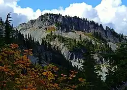 The Pinnacle Saddle Trailhead is located on the south side of the Stevens Canyon Road at Reflection Lakes. The well maintained Pinnacle Saddle Trail climbs 1,050 feet to the saddle in 1.25 mile length. From the saddle between Pinnacle and Plummer Peak, a climber's path traverses the north slope of Plummer Peak. Reaching the summit of Denman Peak is short class 2-3 scrambling.[5]