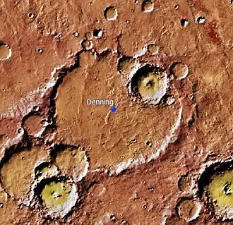 Denning Crater is a large Noachian-age impact crater in the southwestern Terra Sabaea region of the southern Martian highlands, within the Sinus Sabaeus quadrangle. It is located to the northwest of the Hellas impact basin within the furthest outskirts of the Hellas debris apron. The crater is 165 km in diameter and likely formed during the Late Heavy Bombardment, a period of intense bolide impacts affecting the entirety of the Solar System; during the Hesperian period, aeolian processes caused significant degradation of the crater's rim features and infilled the crater's floor (which is nearly at the same elevation as the surrounding plains terrain). Similar to other large craters in this region of Mars, wind-eroded features are sporadically found on the basin floor. The presence of wrinkle ridges of varying orientations within and around the Denning basin has been correlated to regional tectonic events, including the formation of the Hellas basin itself. The crater was named for British astronomer William Frederick Denning.