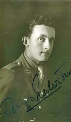 During the war Neilson-Terry served in the Royal West Surrey Regiment, and was demobilised in 1917, when he resumed his theatrical career.[2] In his post-war productions he opted for crowd-pleasing, light plays, as his father had done before him. As The Manchester Guardian put it, "Before the war Mr Neilson-Terry was characteristically a Shakespearean and romantic actor. After the war he put on horned spectacles and a scarf, resembled Mr Harold Lloyd of the films, and acted 'silly ass' detectives who were cleverer than they looked."[7] Of his later stage productions, one performance stood out: that of a frightened man in a haunted room in Ned Lathom's play Fear, which, the Guardian critic wrote, "signalled unmistakably that Neilson-Terry was a developing actor with his best work still to come".[7]