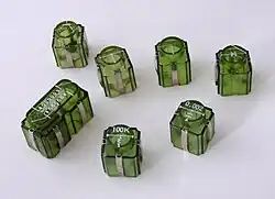 The size and shape of denshi blocks depend on the kit they are from. The blocks of a particular kit will have the same height, usually a few centimetres, and cover a square or rectangular area a few centimetres on either side. They are designed to fit into a grid of squares, so blocks always occupy some rectangular area of these squares, with the majority of blocks occupying just one square.