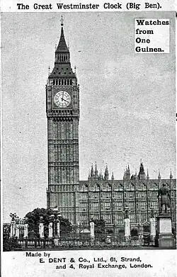 Dent London was a London manufacturer of luxury clocks and watches, founded by Edward John Dent. Dent began making watches in 1814, although the Dent triangular trade mark was not registered until 1876. A notable success for the company was winning the contract to make the clock for the new palace of Westminster, which became known as Big Ben.