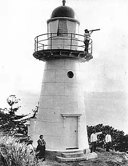 The tower was constructed in the unique Queensland method of constructing a timber frame and cladding it with non-structural iron plates or iron sheets.[2] The original apparatus comprised a fourth order lens with an oil wick burner[8] of 4,000 cd intensity.[2] Like other lighthouses at that time it used a clockwork mechanism with weights, which had to be wound periodically. Due to its short height, only 6 metres (20 ft) from the base to the lantern,[4] the mechanism had to be wound every 75 minutes.[9]