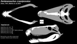The skull of Dentaneosuchus was altirostral, meaning that unlike in modern crocodilians, it was higher than it was wide. This is clearly shown by the preserved premaxilla. The nares are preserved in the form of two narial openings separated by processes of the premaxilla and nasal bone that meet in the middle. They, like the skull, are higher than wide and face forward. The premaxilla contains five teeth on either side, with the bone bulging around the roots of tooth. The first premaxillary tooth, located close to the midline, is the smallest and the teeth get progressively larger until reaching their maximum size at the fourth tooth, which is twice the size of the second. The fifth is smaller again, about as large as the third tooth. The premaxillary teeth are followed by a pronounced notch, which likely received an enlarged dentary tooth. Very little of the maxilla is preserved, but it still reveals important information on the skull of Dentaneosuchus. The maxilla appears to be fused to the nasal bone, obscuring the suture between the two. Furthermore, the way the two elements connect shows that the rostrum of Dentaneosuchus would have been trapezoid in cross section, meaning it was broader around the toothrow and narrowed towards the top. More is known of the nasal, which is preserved in two large chunks. The first is connected to the maxillary fragment, while the more posterior piece is still connected to the skull table. The nasal duct was separated by a septum and the surface of the nasal bone shows no suture, indicating that rather than being paired, the nasal bones were fused into a single elongated element. The nasal was long, stretching from the front of the rostrum where it contacts the premaxilla and likely contributed to the bony wall separating the nares to the frontal bone. As the bone tapers towards the front of the skull, it takes on a wand-like appearance. The prefrontals are plate-like bones situated atop the head and overhanging the eye sockets. The lacrimal bones are only poorly preserved, but face more to the sides than the prefrontals. The various bones of the skull table (frontal, parietal, supraoccipital and exoccipital) are all fused into a single mass. In Dentaneosuchus the space between the orbits and the supratemporal fenestrae is preserved. Only a small piece of the quadratojugal is preserved.[5]